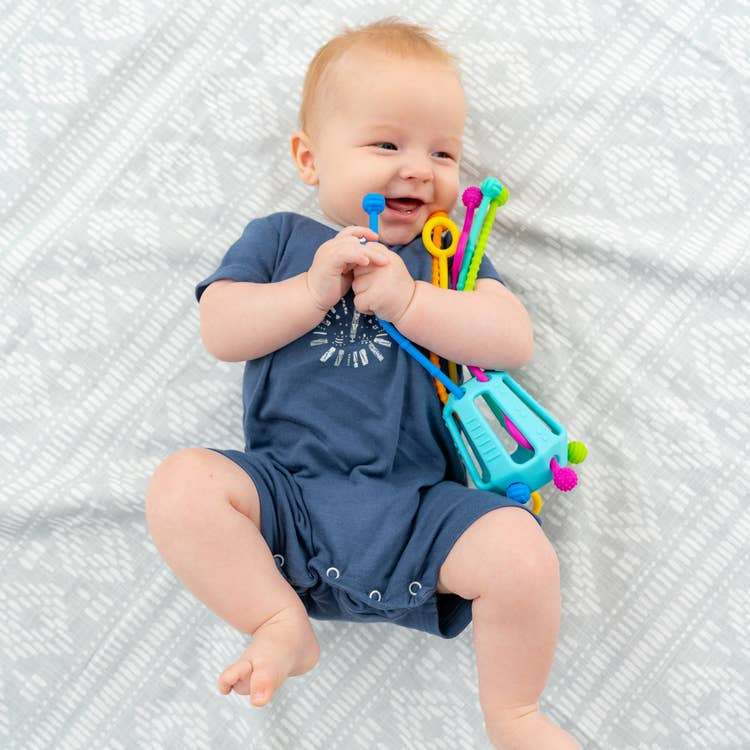 We teamed up with doctors and therapists to create an alternative that was clean, safe and playfully therapeutic. Little fingers can't resist Zippee's flexible and soft teething edges, textured cords and easy to hold grips. Zippee was designed to encourage and support motor skills, sensory exploration, midline play and cause and effect.